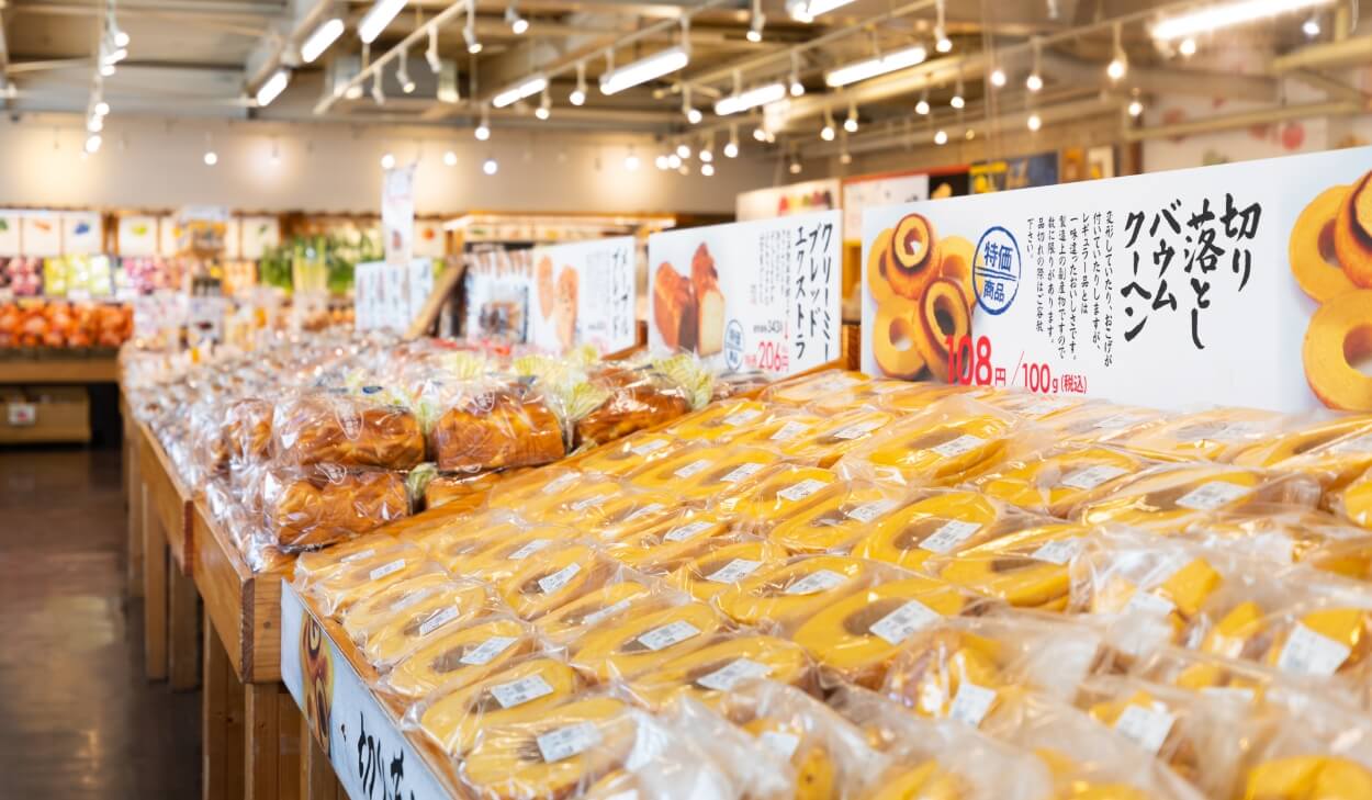 もったいない精神と食品ロスを無くすことを目的として、工場で過剰生産されたパン・菓子や形の悪い(B級品)、ふぞろいの野菜等の販売を行っています。また、ここでしか買うことのできない直売店限定商品も販売しています。